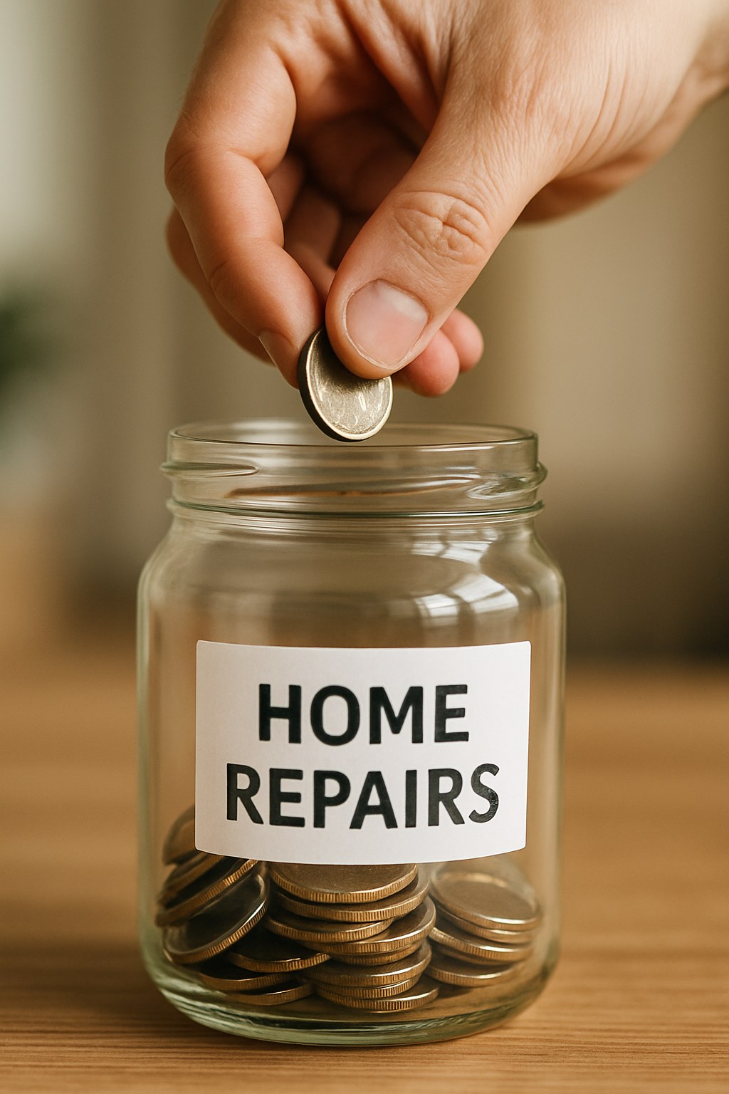 Image Alt: A glass jar labeled "Home Repairs" being filled with coins, symbolizing saving for maintenance.