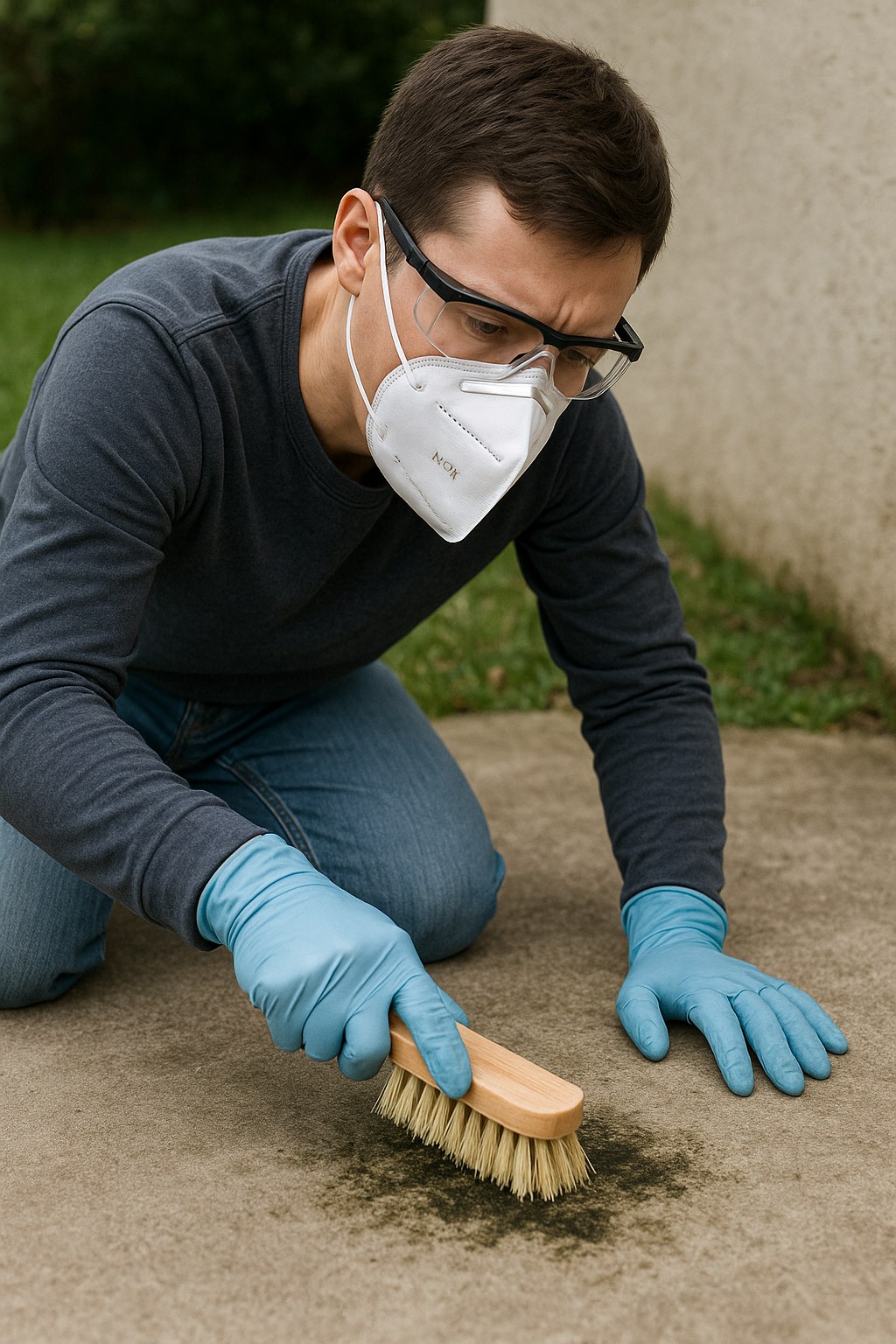 - Sweep the Surface: Use a stiff broom to sweep all loose debris—leaves, twigs, dirt—off the patio. You want to clean the mold, not the dirt sitting on top of it.