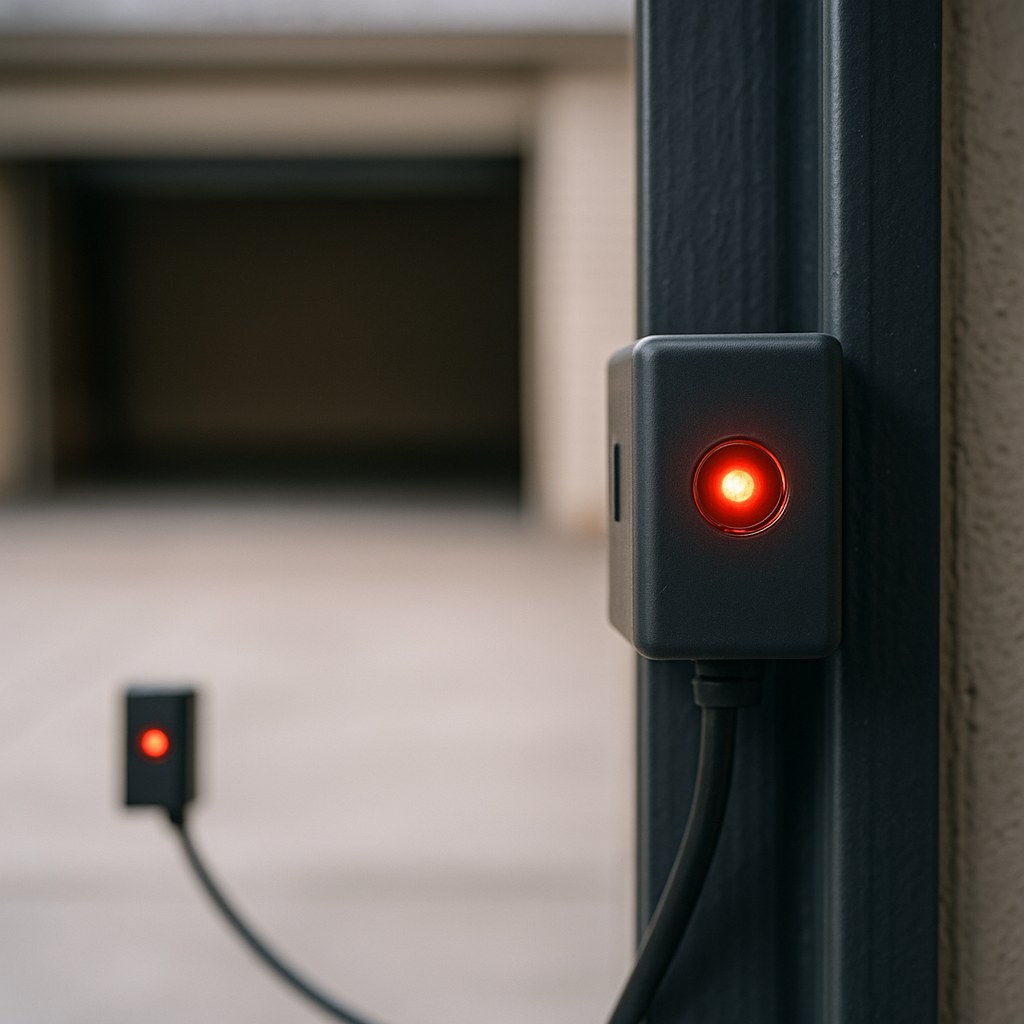 If the door starts to close but then reverses and goes back up, the problem is almost always the safety sensors. These are two small "eyes" located at the base of your garage door tracks, about 6 inches off the floor. They project an invisible infrared beam across the opening. If anything breaks this beam while the door is closing, the door automatically reverses to prevent injury or damage.