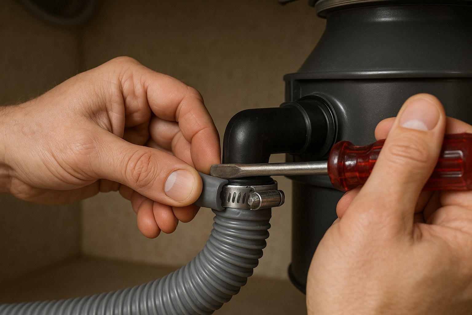 - Use a flathead screwdriver or a nut driver to tighten the metal clamp that holds the rubber dishwasher hose to the disposal's inlet connection.