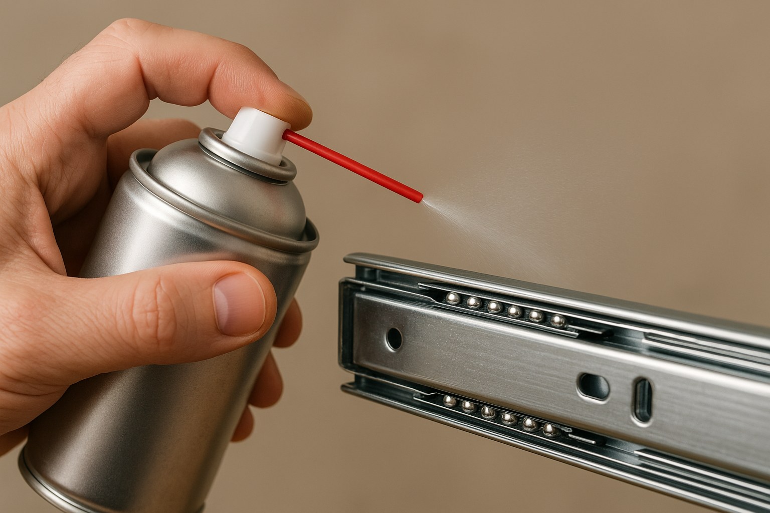 - Apply a thin coat of silicone spray directly onto the ball bearings or the track where the roller moves. Use the thin straw applicator that comes with the spray for precision.