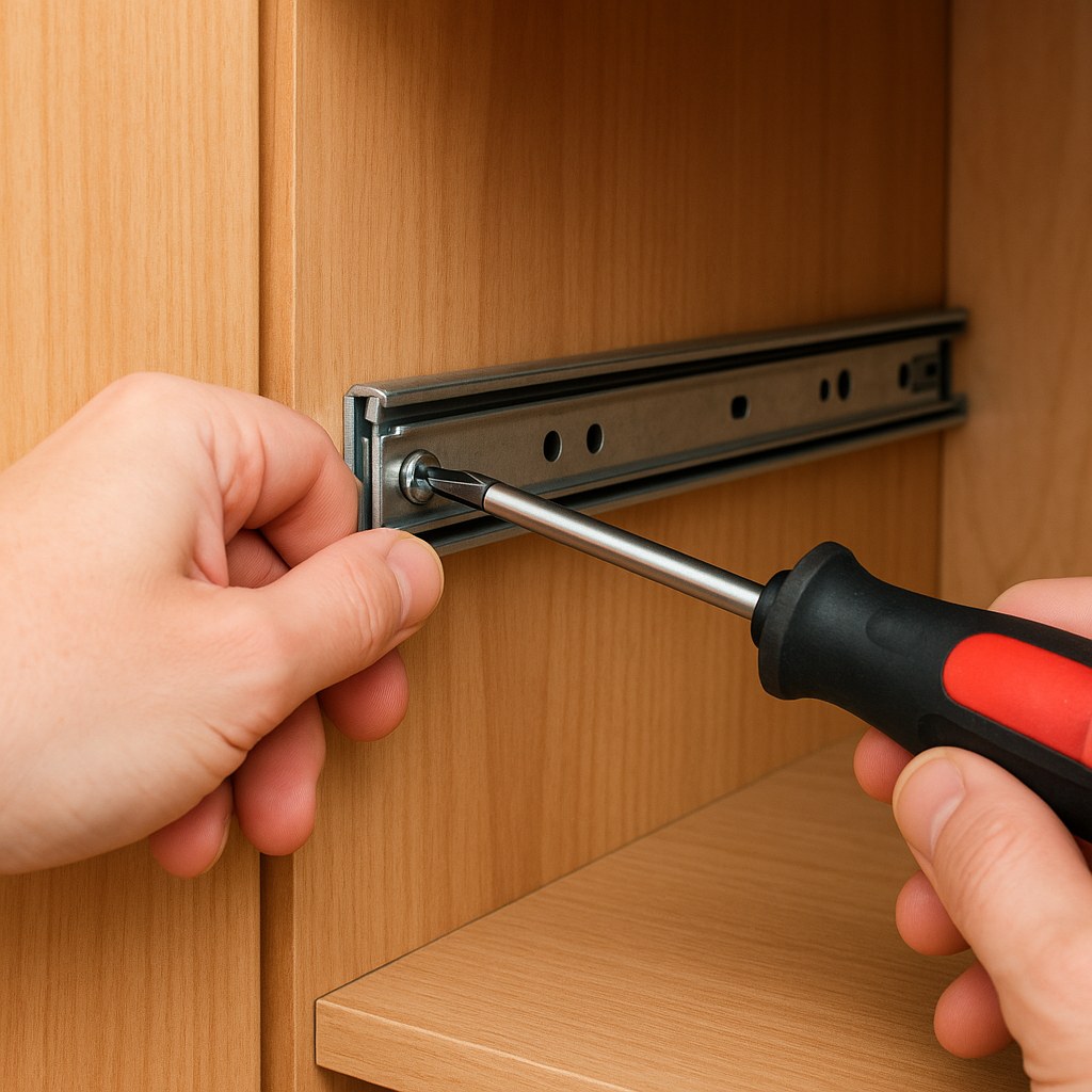 - Systematically check every screw on all four slide components (one on each side of the drawer, one on each side of the cabinet interior).