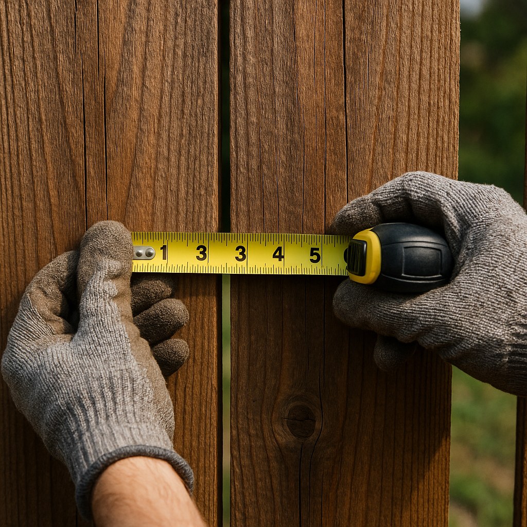 imageAlt: "A homeowner wearing work gloves measures a gap between two fence pickets."