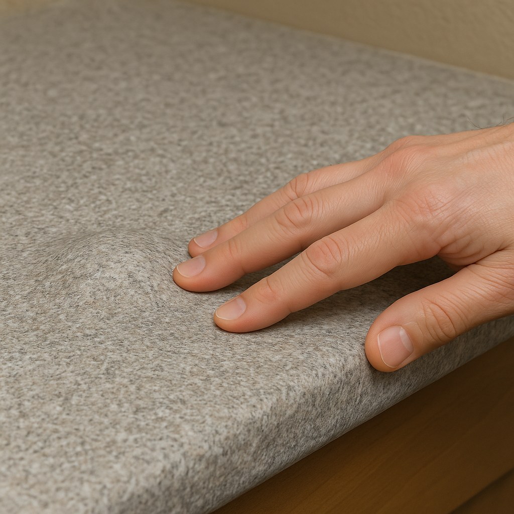 - Feel the surface. Gently press down on any suspicious spots, especially bubbles or lifted seams. Does the area feel solid, or is it soft and spongy? A soft spot is a red flag for moisture damage in the particleboard substrate underneath, which is a more serious problem.