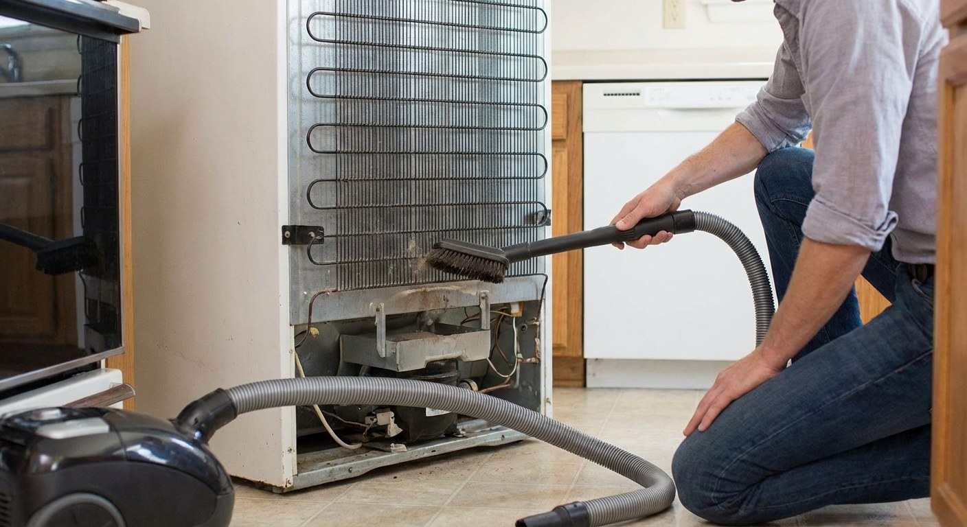 Image Alt: A homeowner carefully cleaning the condenser coils on their refrigerator with a vacuum.