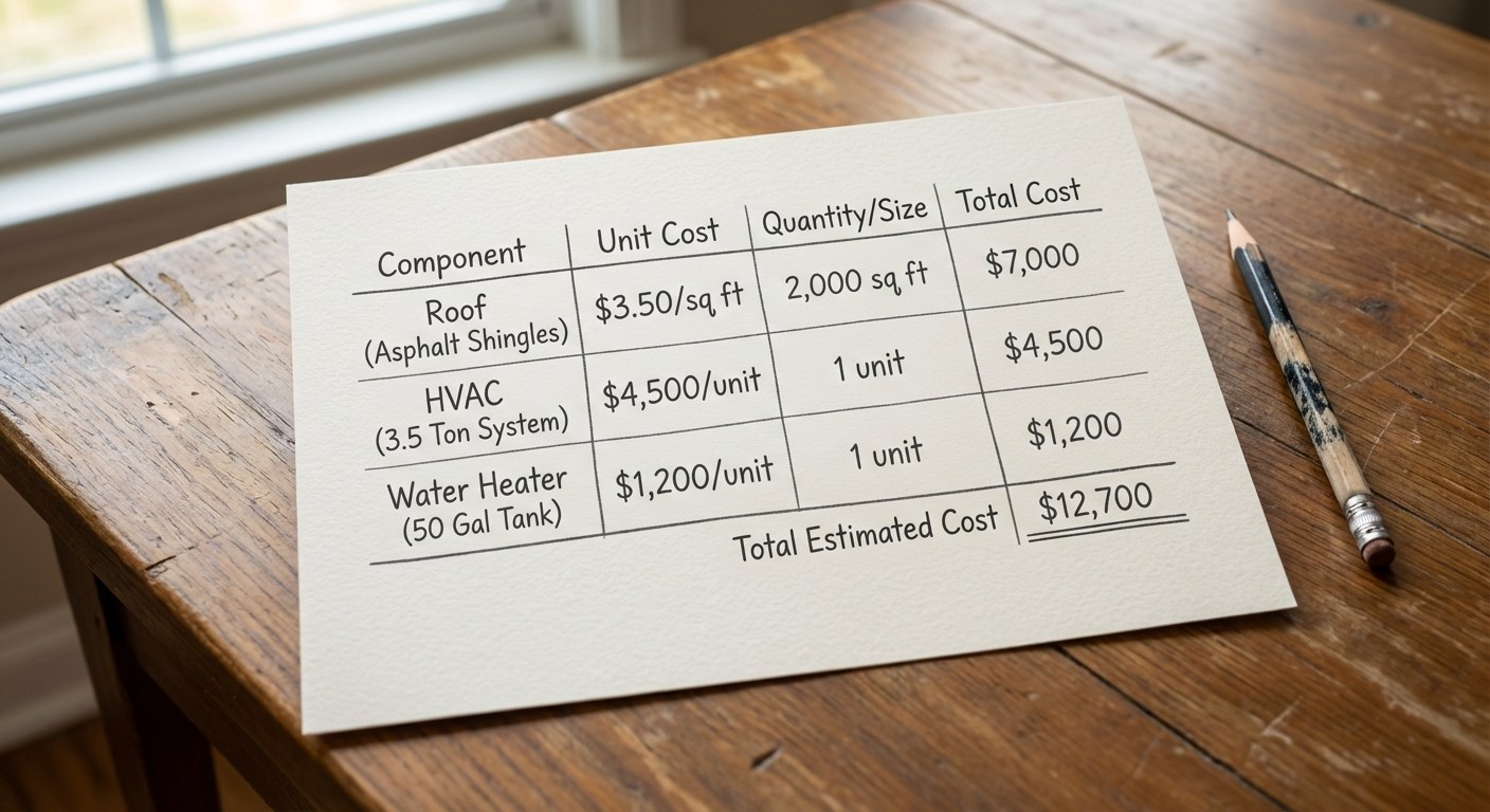 | Item | Est. Replacement Cost | Remaining Lifespan | Annual Savings | | :--- | :--- | :--- | :--- | | Roof | $12,000 | 10 years | $1,200 | | HVAC System | $9,000 | 8 years | $1,125 | | Water Heater | $1,800 | 5 years | $360 | | Total | | | $2,685 |
