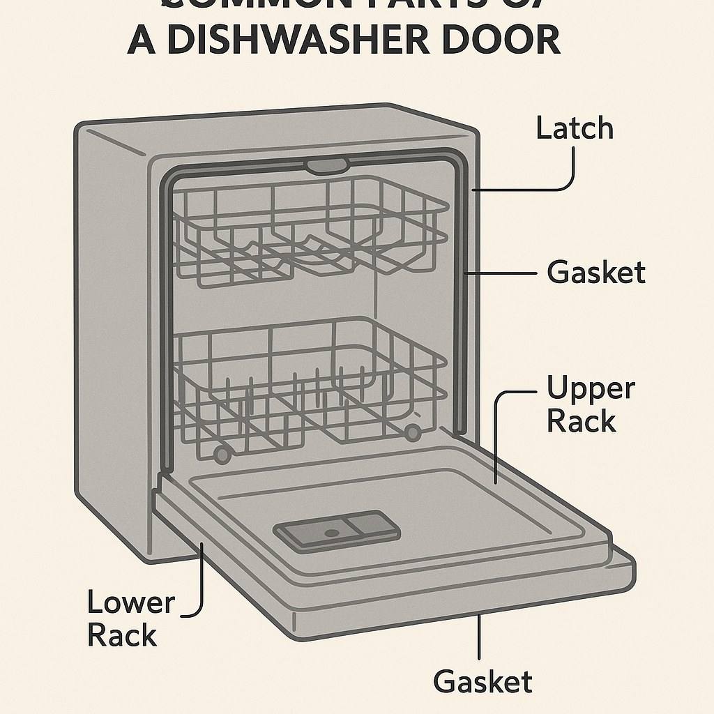 Image Alt: "Illustration of a dishwasher door highlighting the latch, gasket, and dish racks."
