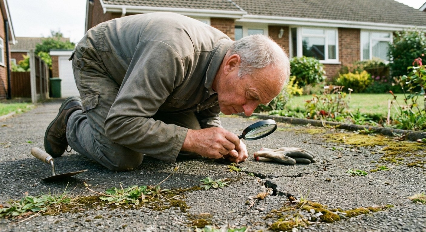 Image Alt: A homeowner wearing gloves kneels to inspect the texture of their driveway material.