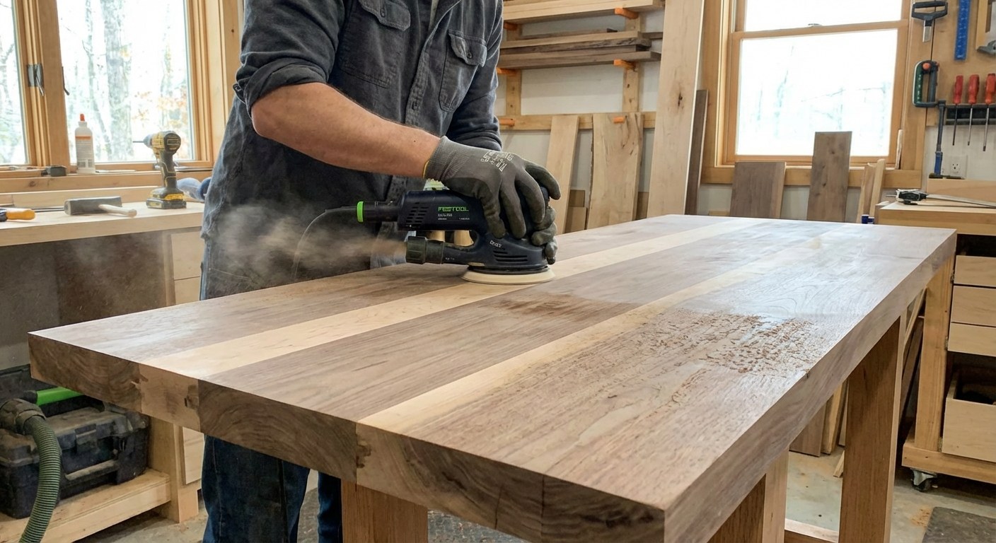 You will need a random-orbit sander. Start with 80-grit paper to strip the old orange-peel finish, move to 120-grit, and finish with 180-grit. Once bare, apply 2-3 coats of polyurethane with a foam roller, sanding lightly between coats.